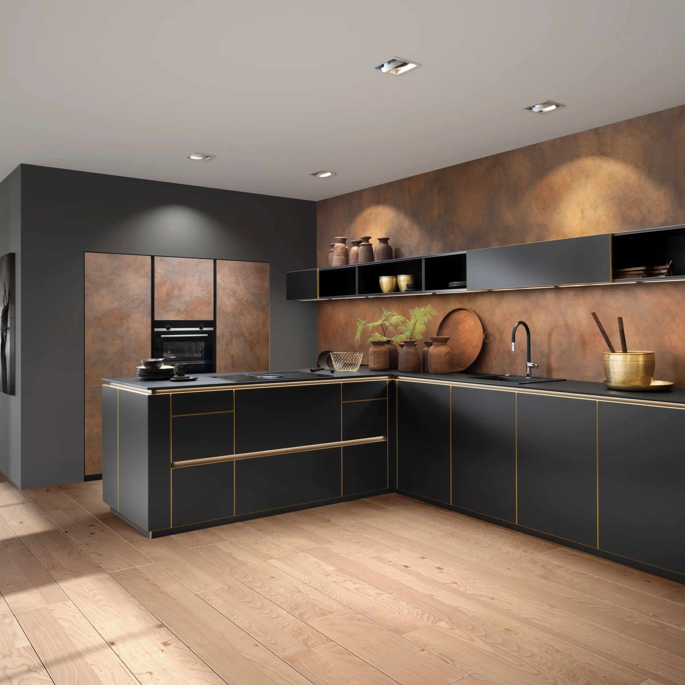 Verfügbar in den ausdrucksstarken Tönen Blaustahl und Cortenstahl, bringt FERRO die Ästhetik von Stahl und Rost in die Küche – ohne künstlichen Effekt, sondern mit authentischer Tiefe. Die leicht changierende Oberfläche verleiht jedem Raum einen industriellen, modernen Charakter und macht jede Front zum Unikat.