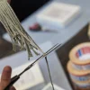 5. Das Gummi zuschneiden (ca. 60 cm für die Eisstiel-Aufbewahrung, ca. 10 cm für die Kugelschreiber-Halterung), zwischen die Heftzwecken spannen und mit einem Knoten schließen.
