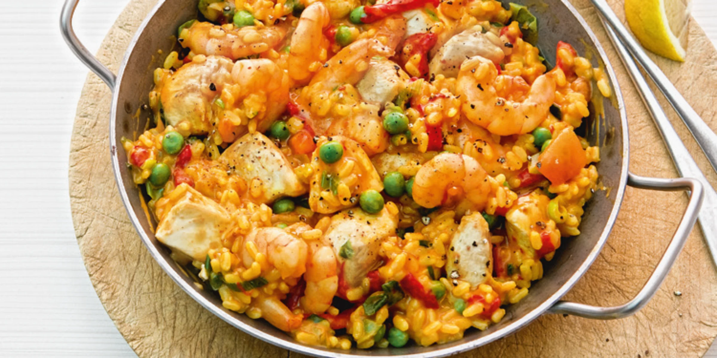 400 g geschälte TK-Bio Shrimps, 200 g geröstete, gehäutete Paprikaschoten (aus dem Glas), 2 Fleischtomaten, 2 Knoblauchzehen, 4 Frühlingszwiebeln, 500 g Hähnchenbrustfilet, 4 EL Olivenöl, 500 g vorgegarter Risottoreis (mit Safran), 800 ml Fischfond (aus dem Glas), 400 ml Gemüsebrühe, 160 g TK-Erbsen, 4 EL Aivar, Salz, Pfeffer, 2 Bio-Zitronen