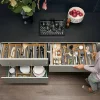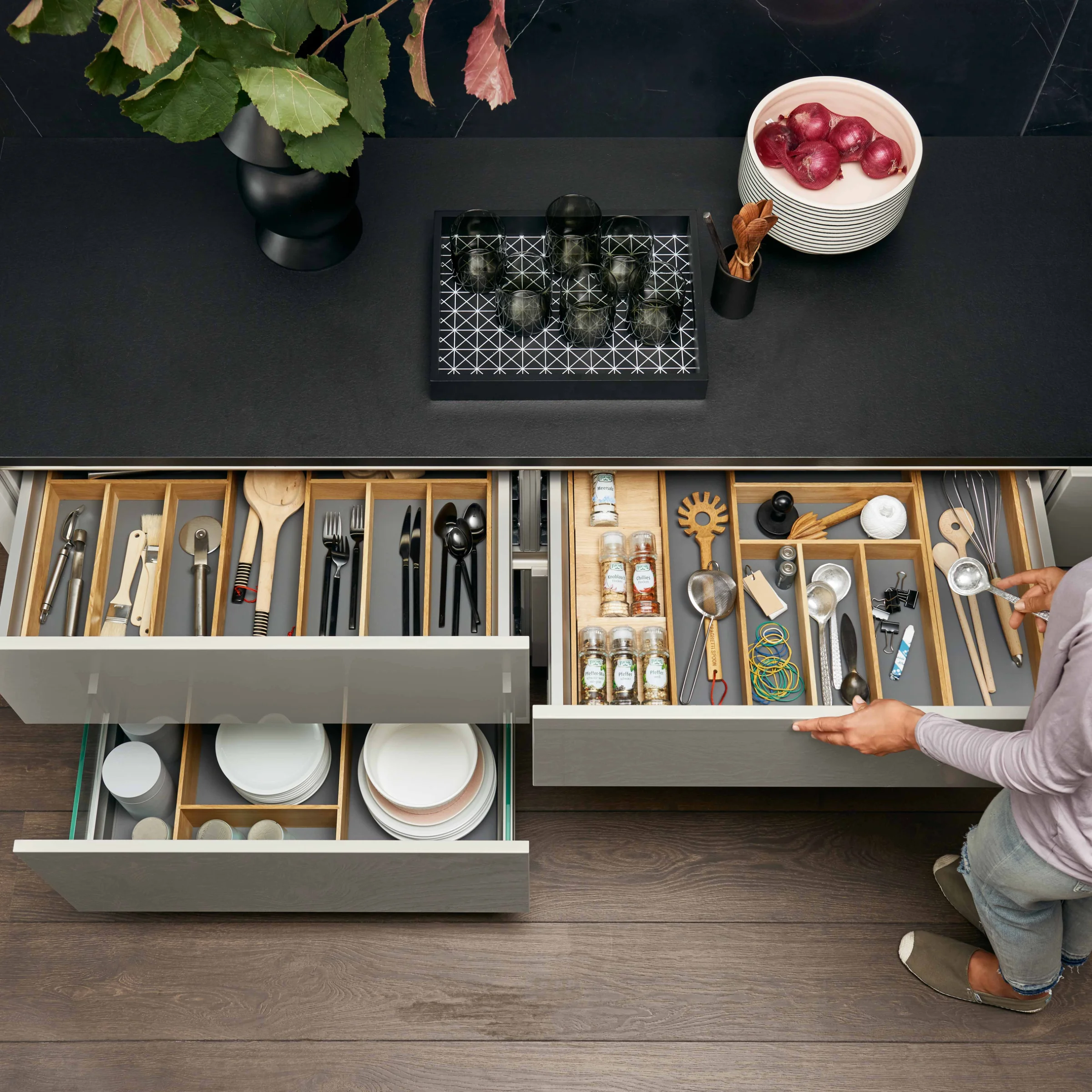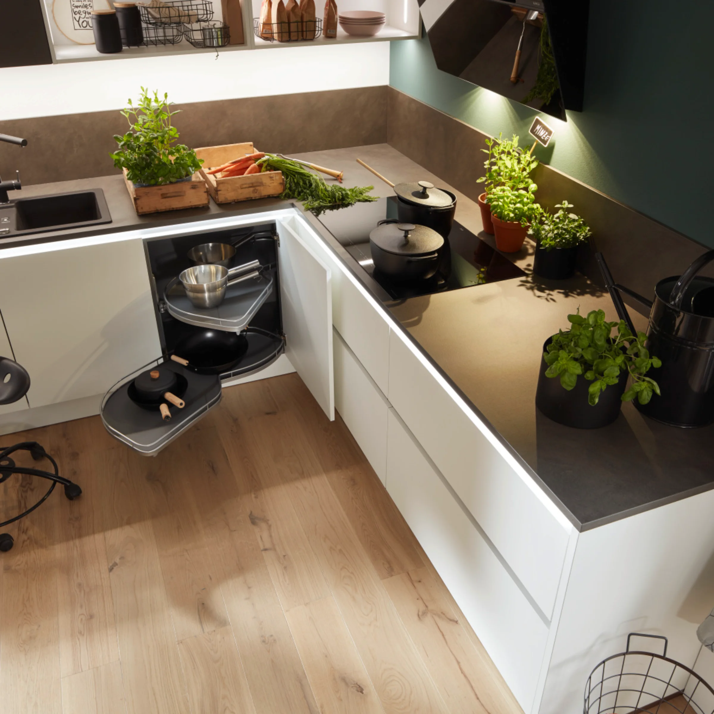 Bei der Auswahl der Spüle spiet auch das Thema Ergonomie eine große Rolle: Arbeiten in der Küche zum Beispiel eher große oder kleine Menschen? Links- oder Rechtshänder (wichtig für die Ausrichtung der Abtropfläche)? Für die Planung ist auch interessant, wo sich der Wasseranschluss befindet und ob Warmwasser beispielsweise durch einen Durchlauferhitzer oder einen Boiler produziert wird. Auch nicht zu vergessen, der Spülenunterschrank. Mit der richtigen Unterteilung und Organisation können Sie hier zusätzlichen Stauraum schaffen. Besonders praktisch ist es, flexible Mülltrennsysteme direkt unter der Spüle zu platzieren. Hier fällt für gewöhnlich der meiste Küchenabfall an und der kann so direkt entsorgt werden – ohne zusätzliche Laufwege.