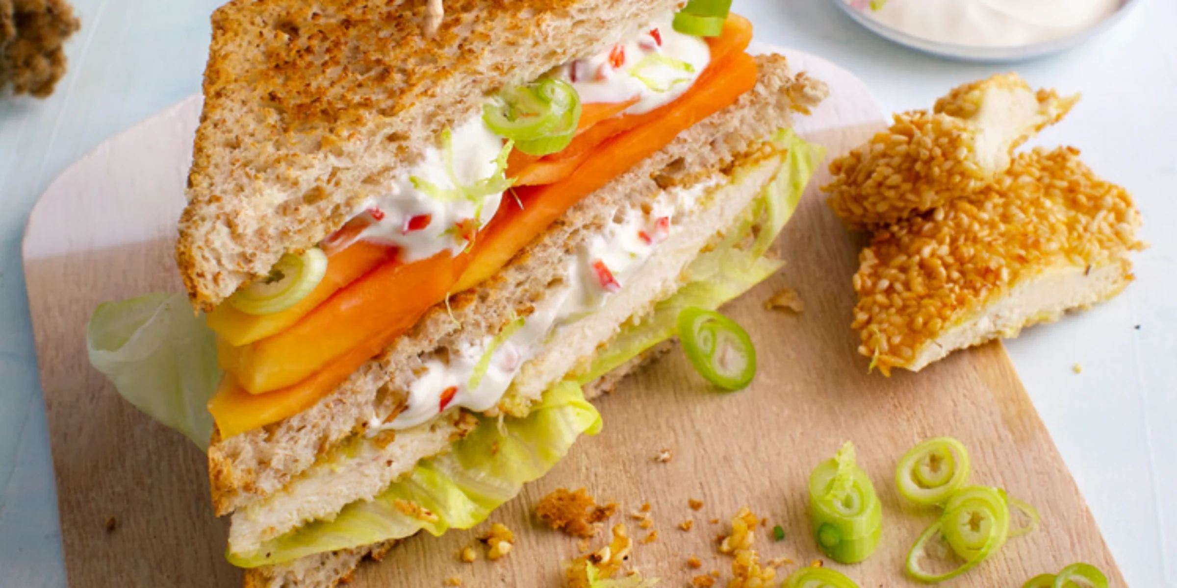 - 4 Brotscheiben mit Salat und Hähnchen belegen, etwas Schmandmischung daraufgeben. Je 1 Brotscheibe auflegen und darauf Papaya, restlichen Schmand und Frühlingszwiebeln verteilen. Die anderen Brotscheiben auflegen, Sandwich halbieren, mit Holzstäbchen fixieren.