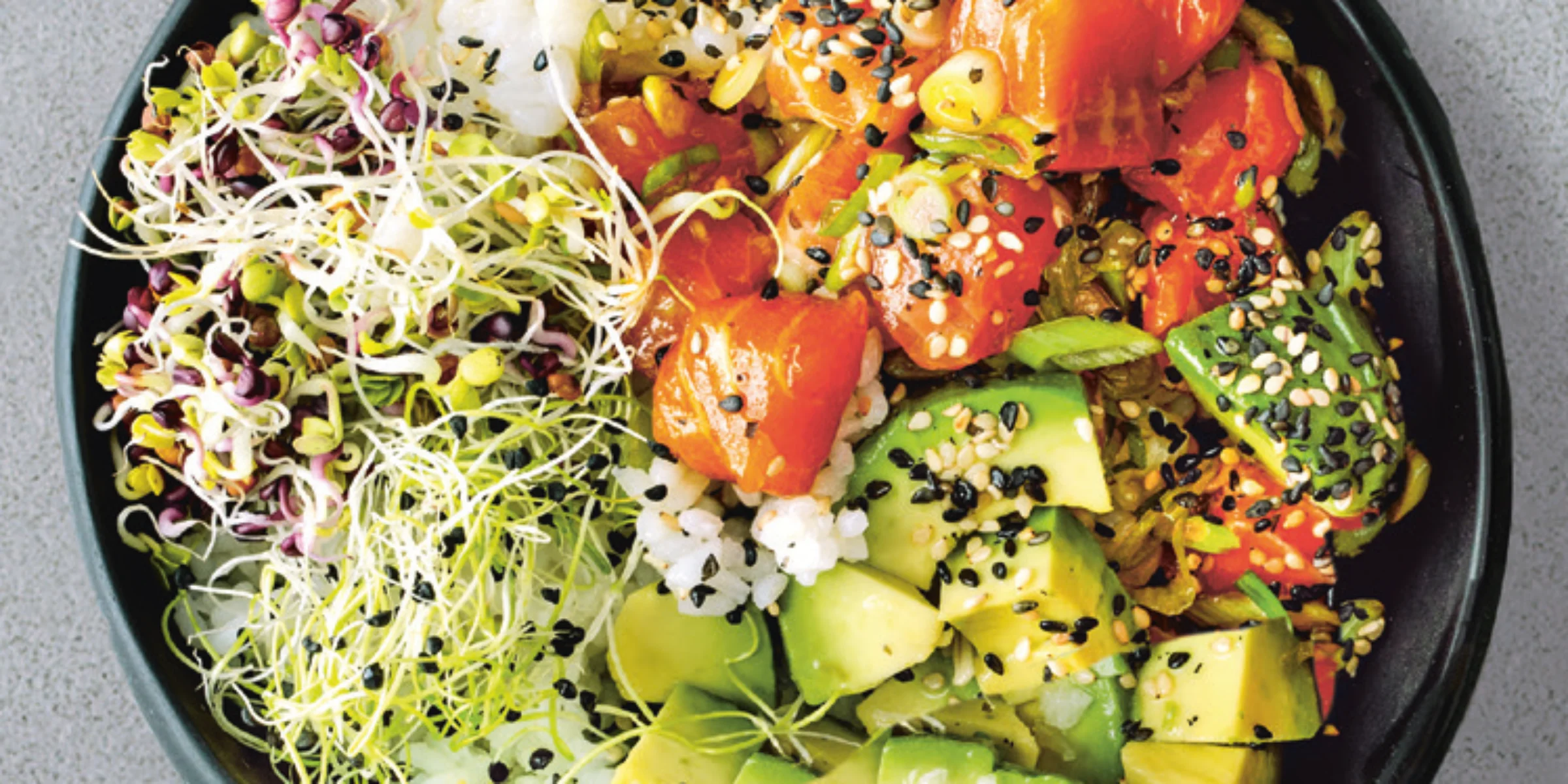 - Beide Sesamsorten in einer Pfanne bei mittlerer Hitze rösten, bis sie duften. Die Sprossen in einem Sieb abbrausen und abtropfen lassen. Den Sushireis in vier Schüsseln geben, den marinierten Lachs, die Avocadowürfel und die Sprossen darauf verteilen. Die Poké-Bowls mit dem Sesam bestreut genießen