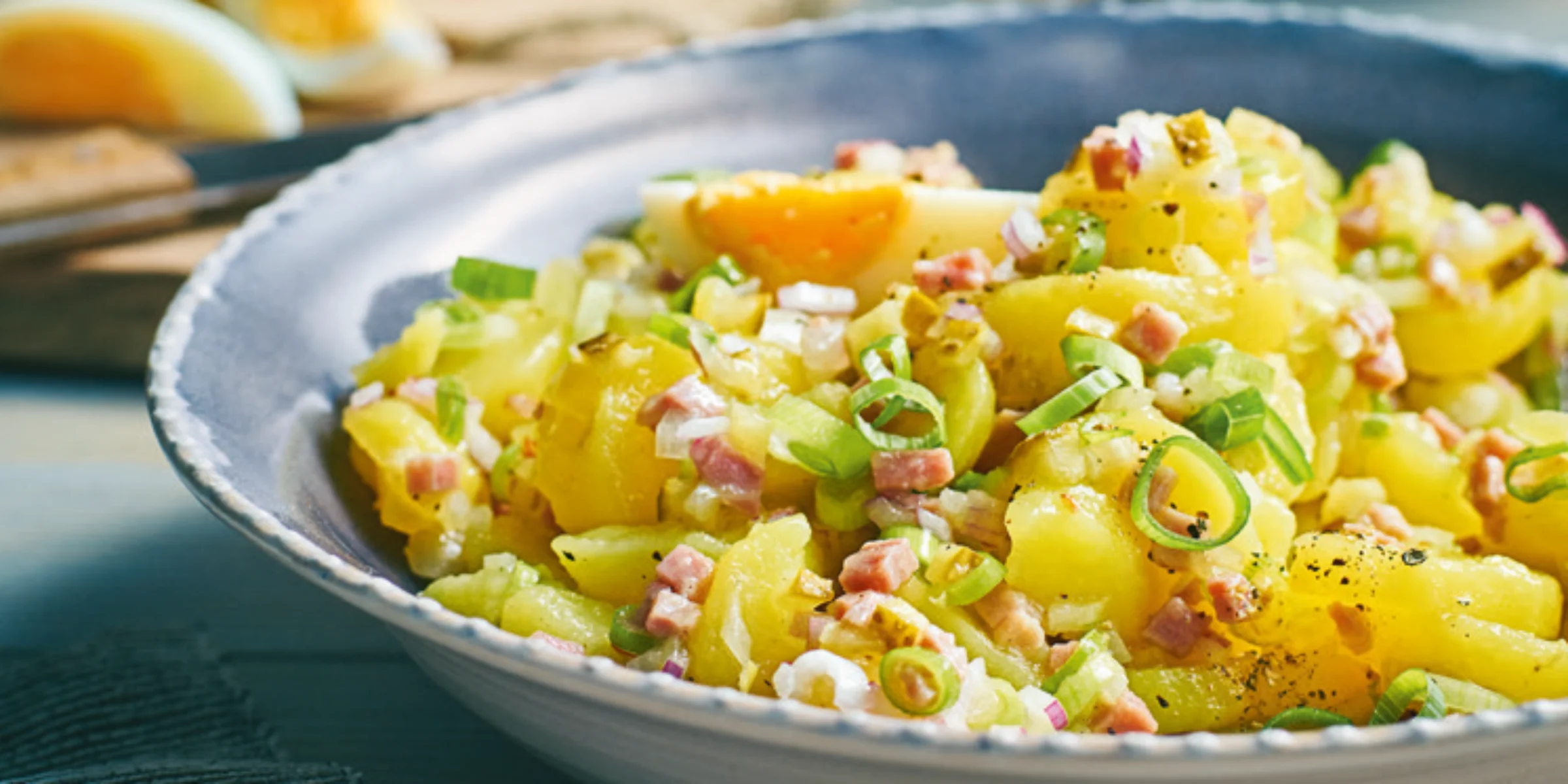 1 kg festkochende Kartoffeln, Salz, 100 g geräucherter, würziger Schinken (am Stück; z.B. Schwarzwälder Schinken), 1 große gelbe Zwiebel, 1 rote Zwiebel, 3 EL kalt gepresstes Hanföl (ersatzweise Walnussöl), 100 ml milder Weißweinessig, Pfeffer, 1 Bund Frühlingszwiebeln, 4 kleine Essiggurken (samt ca. 75 ml Gurkenflüssigkeit), 50–100 ml Gemüsebrühe (nach Bedarf), 4 hart gekochte Eier (M), geschält und geviertelt