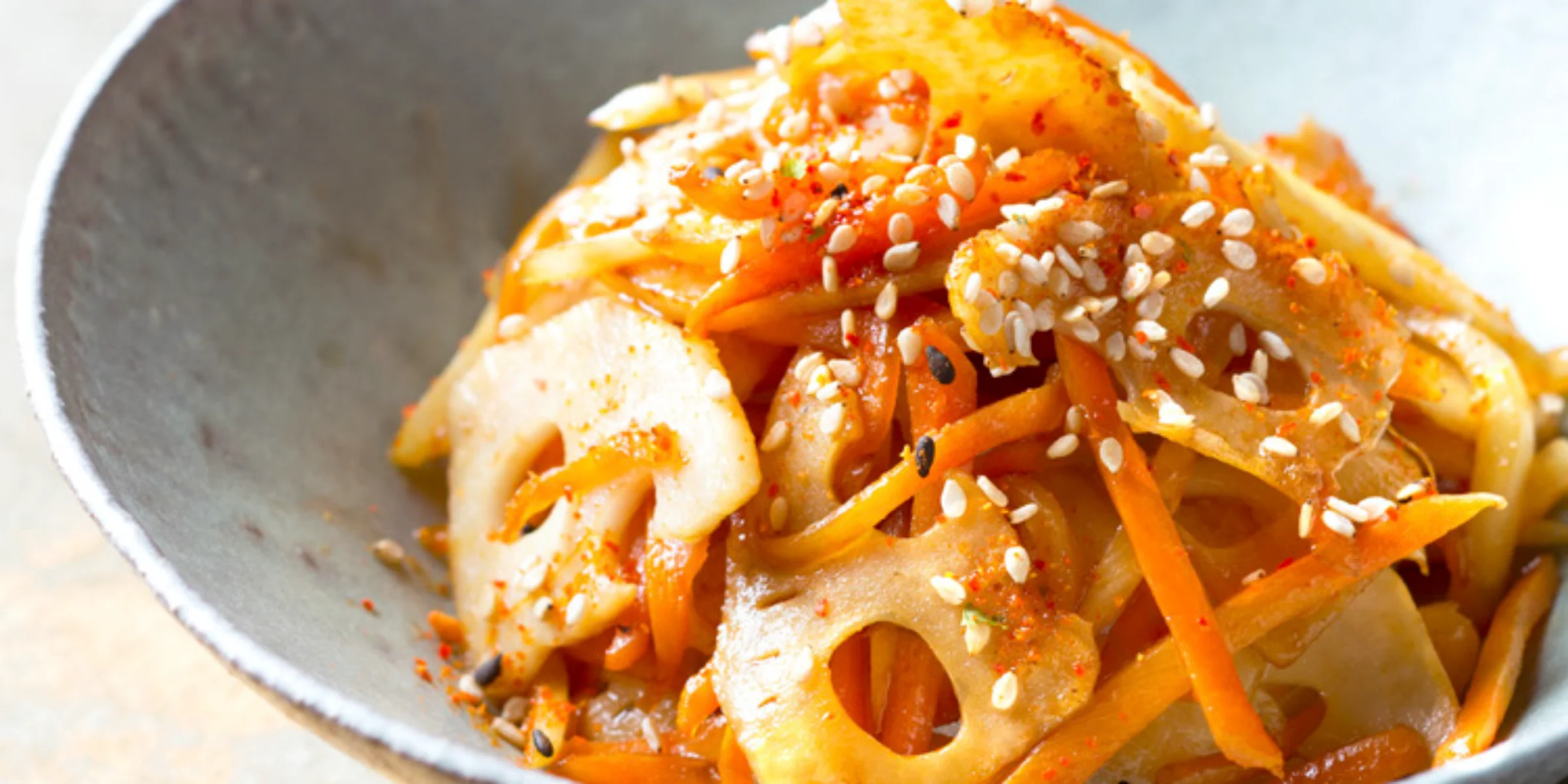 100 g Lotuswurzel (Asienladen; ersatzweise 8 Scheiben TK-Lotuswurzel), 1 EL heller Sesam, 100 g Möhren, 100 g Pastinaken, 2 EL dunkle Sojasauce (Koikuchi), 2 TL Zucker, 1 TL Sake, 1 EL Sesamöl, Shichimi Togarashi (scharfe Würzpaste; ersatzweise Chiliflocken)