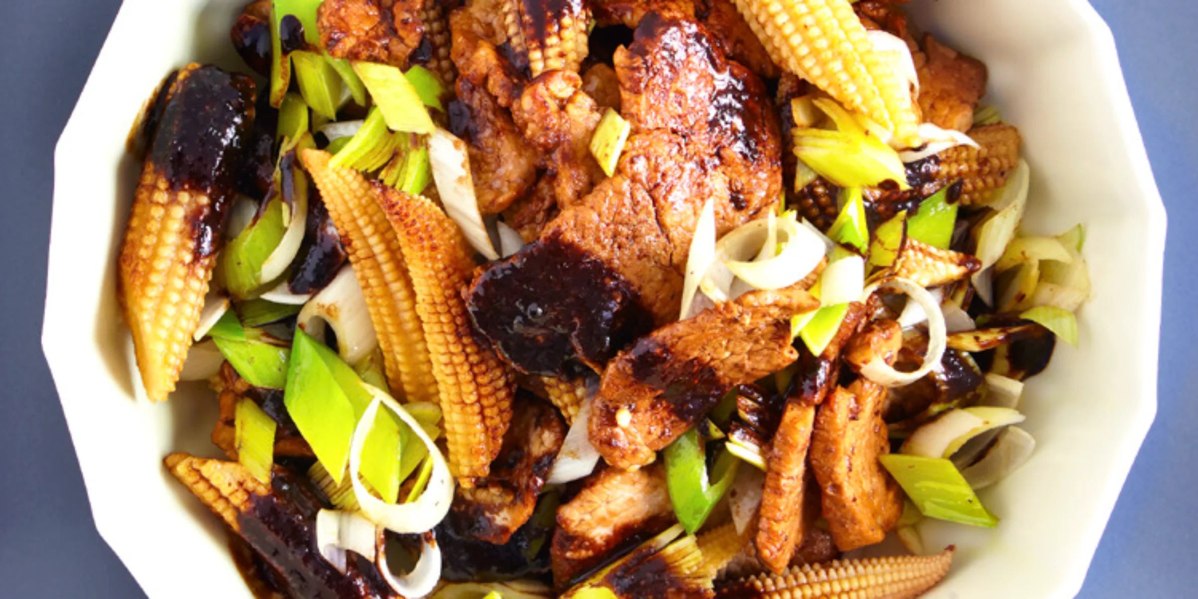 1 Dose Maiskölbchen (in Wasser eingelegt, nicht in Marinade; 280 g Abtropfgewicht), 1 dünne Lauchstange, 500 g Schweinefilet, 2 EL Öl, 3 EL helle Sojasauce, 3 EL schwarze Bohnenpaste (Asienladen), 1 TL Speisestärke, Salz, Pfeffer