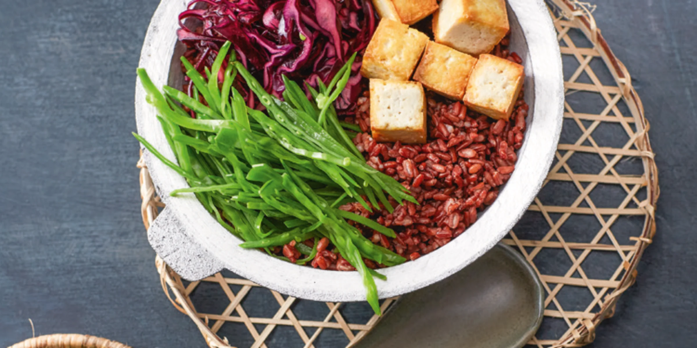 - Brühe und Kokosmilch in einem kleinen Topf aufkochen. Erdnussmus und Currypaste unterrühren und 2–3 Min. bei milder Hitze köcheln lassen. Den Topf vom Herd nehmen und das Dressing mit Limettensaft, Salz und Pfeffer abschmecken. Reis in Bowls verteilen. Zuckerschoten, Rotkohl und Tofu darauf anrichten. Die Hälfte der Erdnuss- Kokos-Sauce darüberträufeln. Das restliche Dressing dazu reichen.