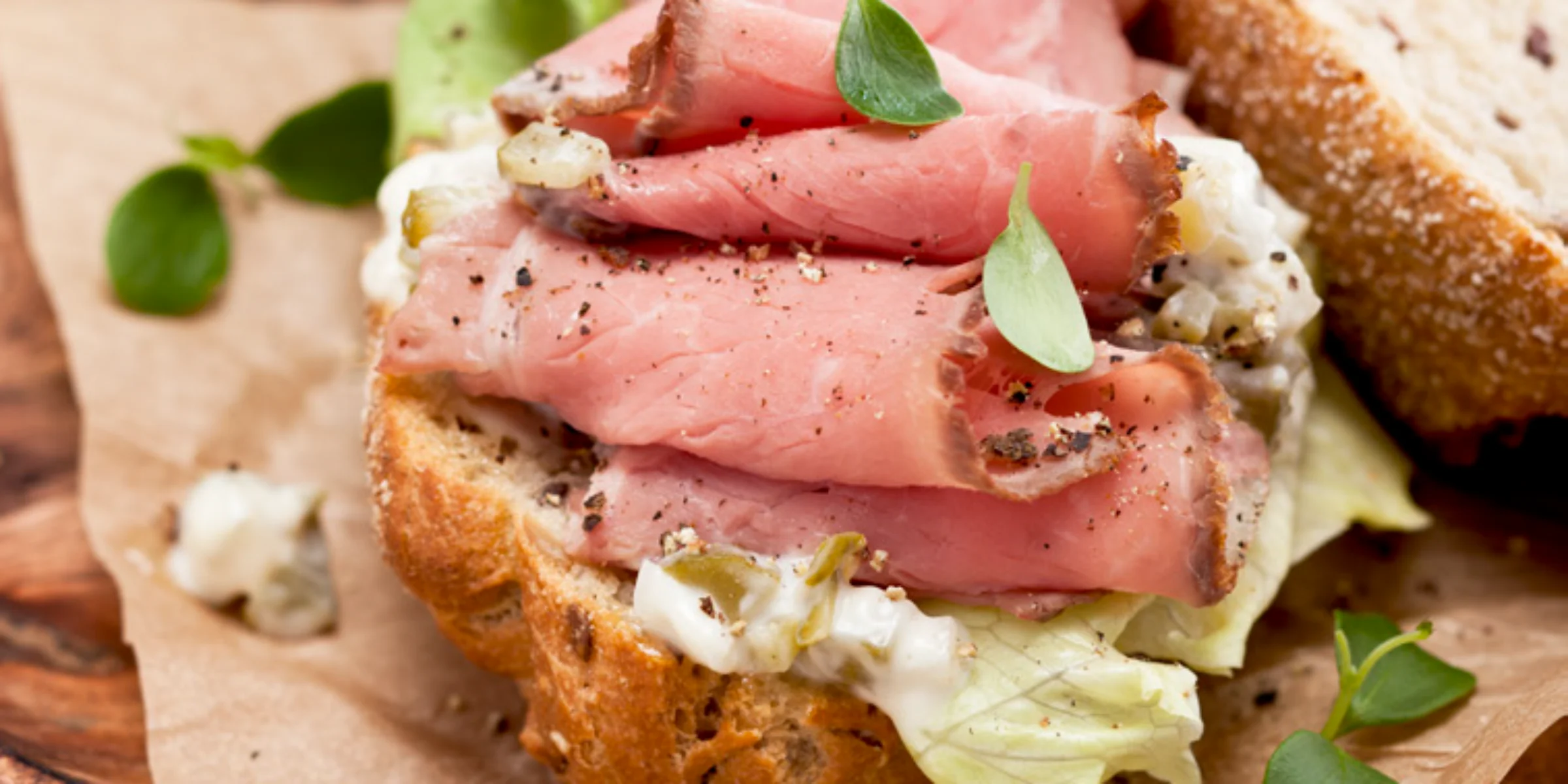 1 Zwiebel, 2 kleine Essiggurken, 4 EL Quark (20% Fett), 4 EL Mayonnaise, 2 TL Senf, Salz, Pfeffer, 8 Blätter Eisbergsalat, 4 Vollkornbrötchen, 24 Scheiben Roastbeef Aufschnitt (ca. 240 g)