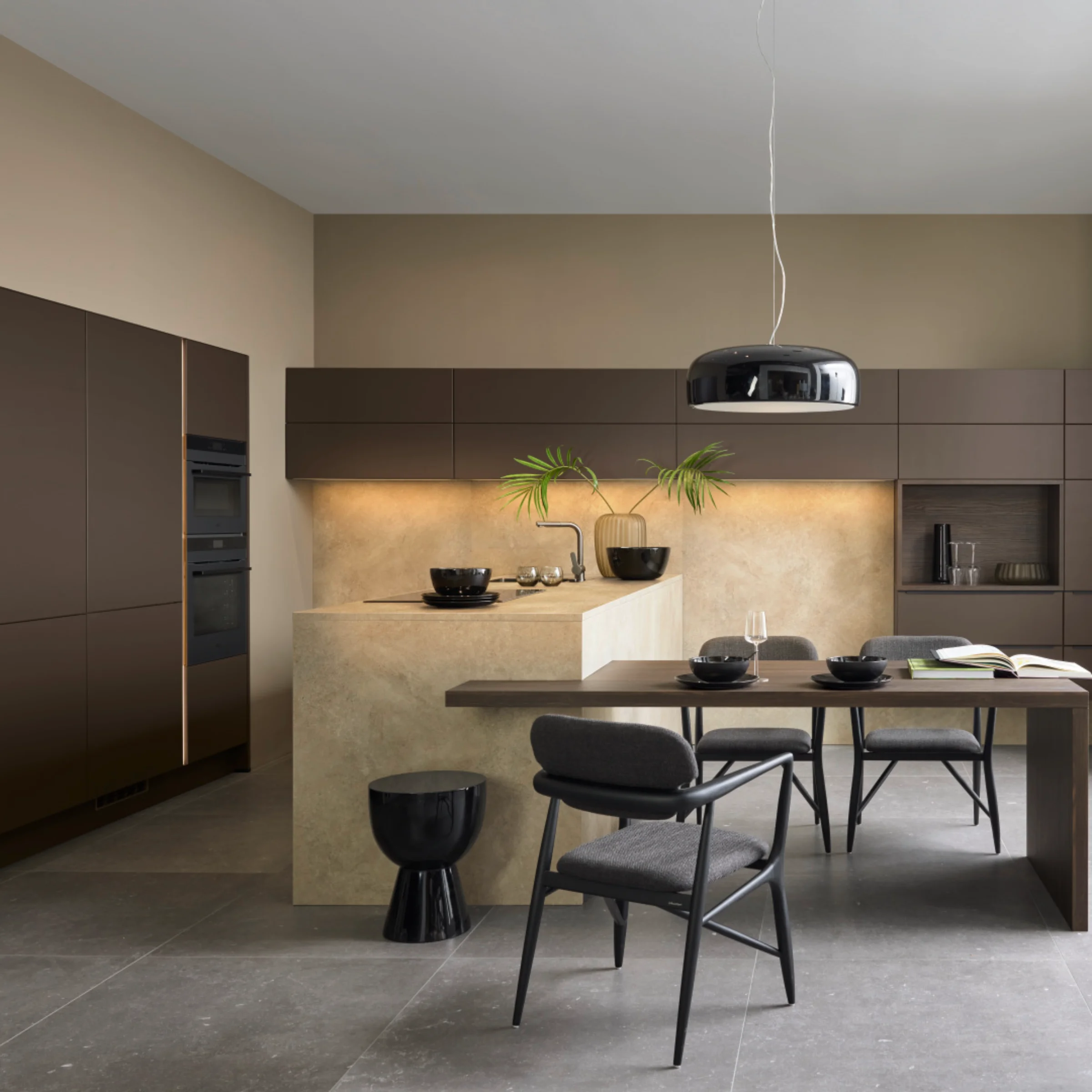 Eine Akzentwand in einem warmen Ton kann ein sofortiger Blickfang sein und der Küche Tiefe und Charakter verleihen.