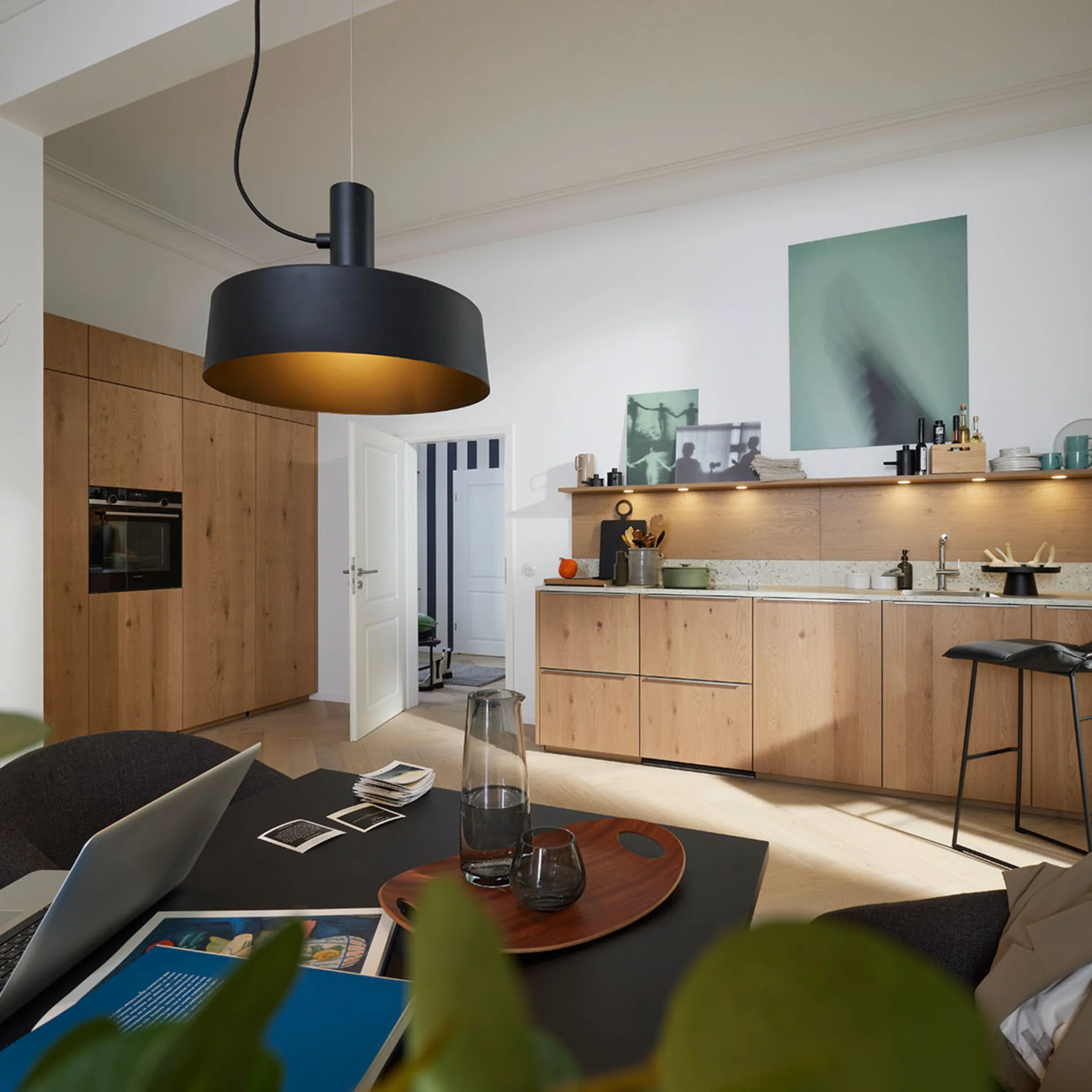 Ob große Kühl- und Gefrierkombination oder einfach nur viel Stauraum: Ein Seitenschrank in voller Raumhöhe bietet jede Menge Platz. Die beleuchtete Griffspur ist dabei ein weiteres optisches Highlight.