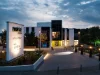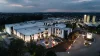 Ein modernes Gebäude bei Dämmerung mit beleuchtetem Nolte Küchen Schild im Vordergrund.