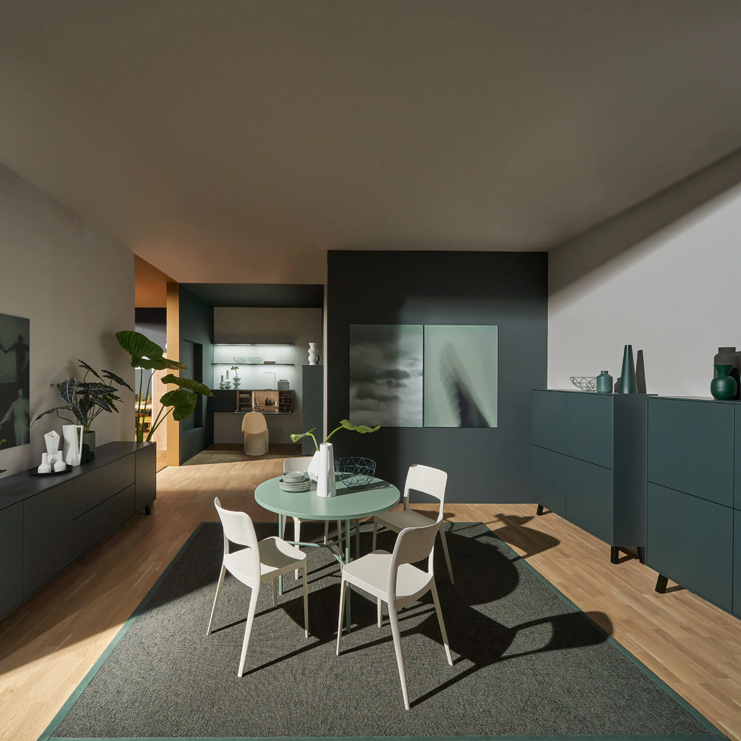 Se beneficia de una sensación de espacio amplio y luminoso, así como de mayor convivencia con familia y amigos. Aparadores, estanterías y vitrinas adecuados ofrecen espacio de almacenamiento adicional y completan el elegante conjunto.